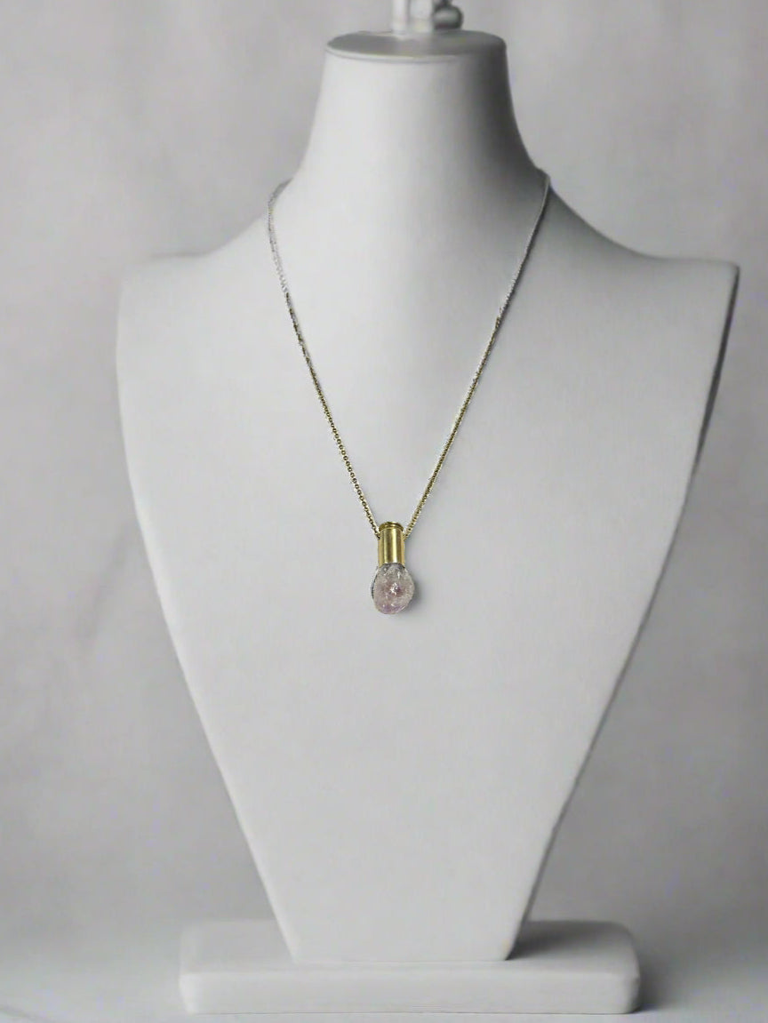 Turn grit into glow. This one-of-a-kind pendant pairs a reclaimed .45 caliber bullet casing with a natural amethyst point—balancing bold, industrial edge with soothing, spiritual calm. Each casing is carefully cleaned and upcycled, then hand-set with a raw amethyst point and finished on a 20" brass chain. Wear it as armor, intention, and conversation starter all in one.