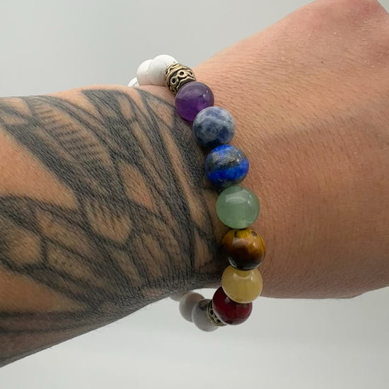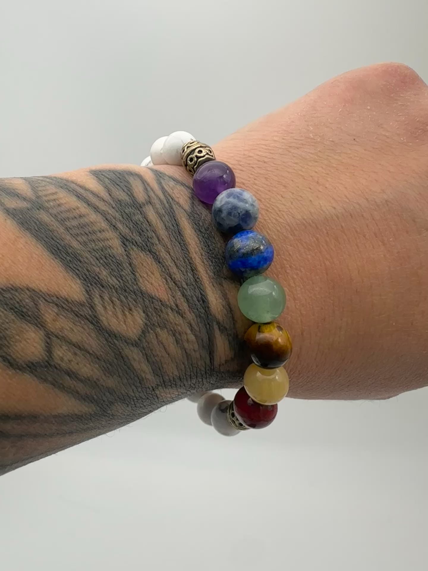 Designed to bring balance, alignment, and intention into your everyday wear, this handcrafted bracelet features the full spectrum of seven chakra stones, each chosen to support energetic flow from root to crown. Smooth howlite beads ground the design with their calming presence, encouraging clarity, patience, and a quiet mind.
