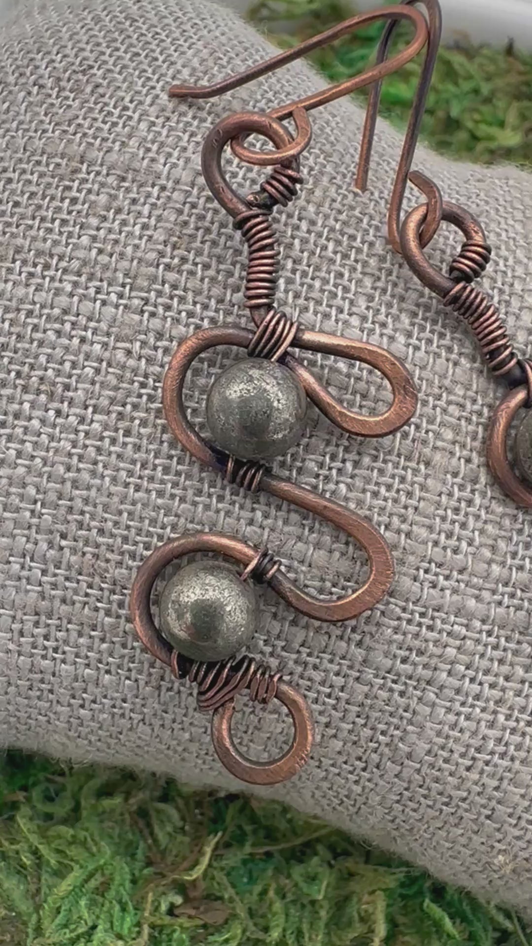 These earrings pair warm, hand-hammered copper with the natural shimmer of pyrite for a look that feels both grounded and luminous. The textured copper catches the light with subtle movement, while pyrite’s metallic sparkle adds a raw, earthy elegance—no two stones exactly alike.