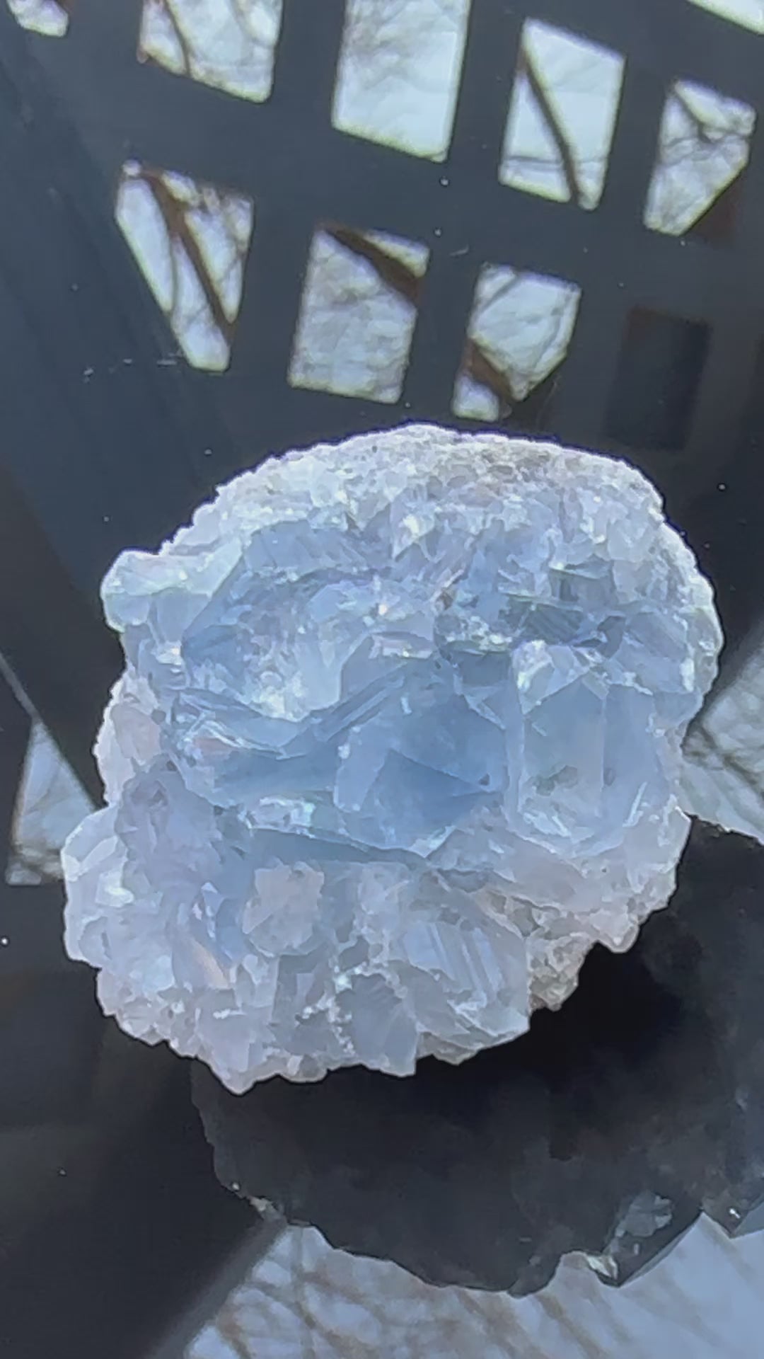 This palm-sized Celestite features delicate blue crystals that promote calm, clarity, and spiritual connection. Found in sedimentary rock formations, it’s ideal for creating a peaceful atmosphere.
