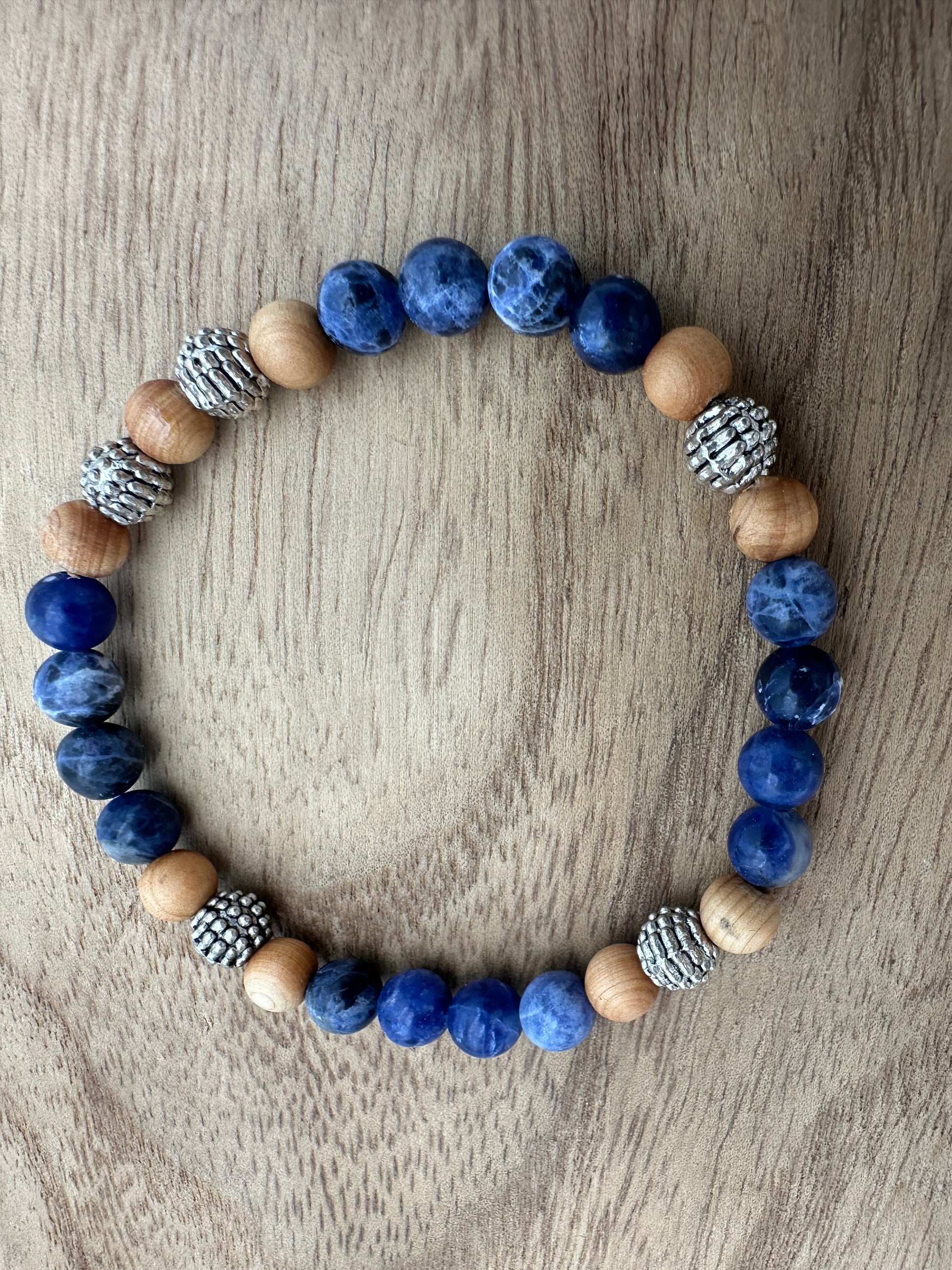 This handcrafted gemstone bracelet combines the deep, celestial blues of Sodalite with the warm, grounding energy of Thuja wood beads, accented by vintage metal beads for a touch of timeless elegance.
