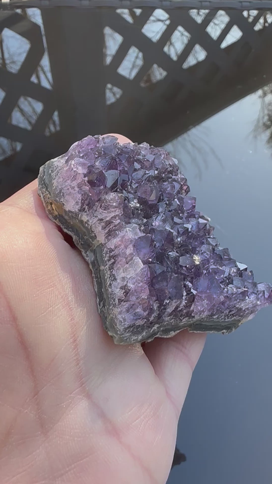 This palm-sized Uruguay Amethyst features deep violet hues and natural formations, making it a powerful addition to any space.